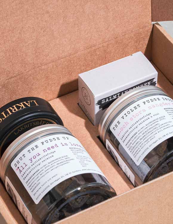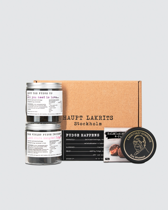 Tämä lahjapakkaus on täynnä rakastetuimpia – ja tinkimättömimpiä – herkkujamme. Myyntihitti Shut the Fudge Up kohtaa uutuuden The Violet Fudge Incident. Lisää mukaan klassinen Lakritsivene Hommage Tore Wretman ja neljän kappaleen pakkaus parhainta kaikista – Salmiakbombenia – ja saat laatikon, joka ratkaisee enemmän ongelmia kuin terapia.
