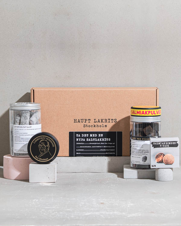 Lahjalaatikko. Sisältää Svenskjävlar! (250g), Shut the fudge up (250g), Salmiakbomben 4-pack (48g), Lakritsiveneet (45g) sekä Salmiakkijauhe (21g)